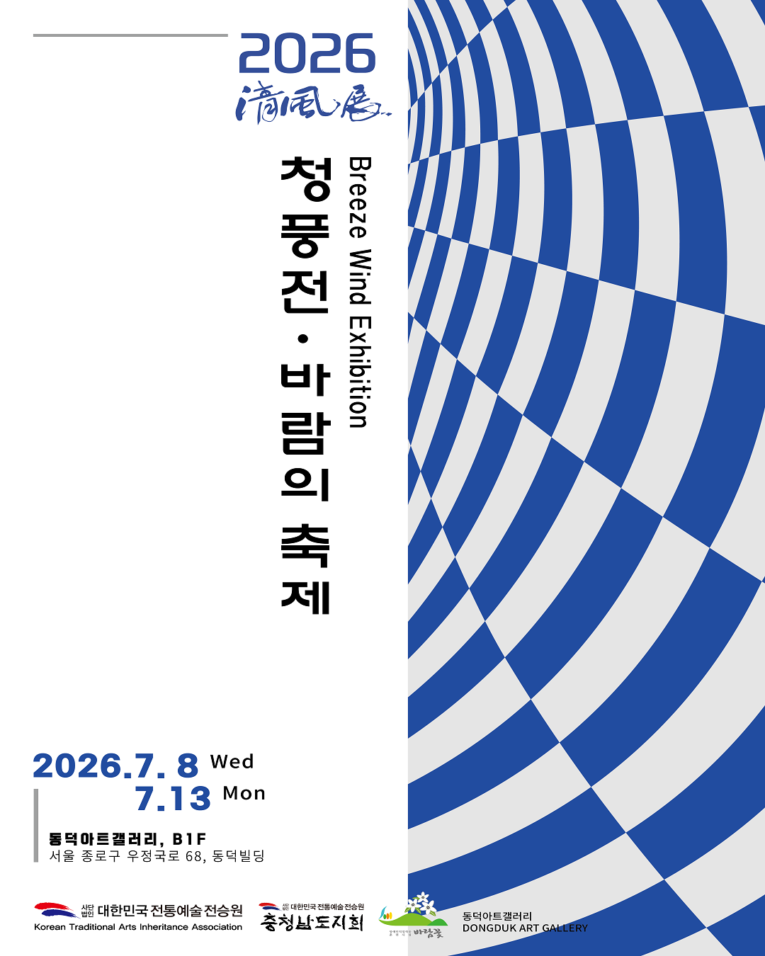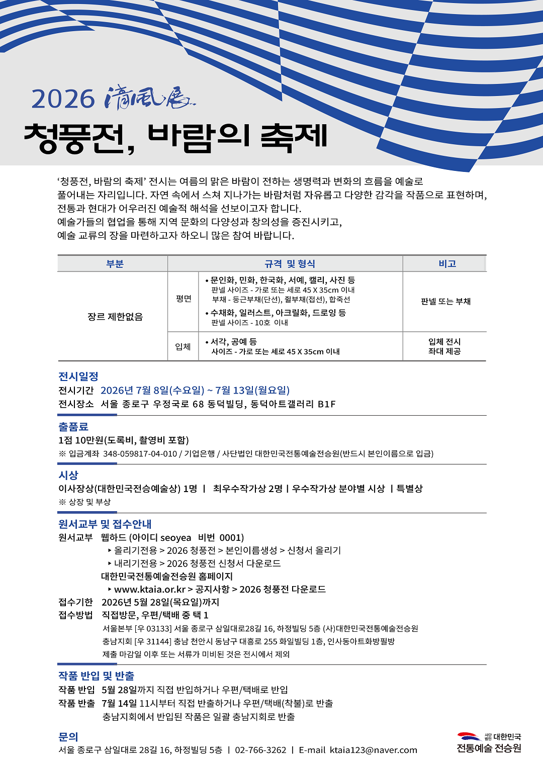 전승원 공고 제2026 – 03호 「청풍전, 바람의 축제」 전시 공고 ‘청풍전, 바람의 축제’ 전시는 여름의 맑은 바람이 전하는 생명력과 변화의 흐름을 예술로 풀어내는 자리입니다. 자연 속에서 스쳐 지나가는 바람처럼 자유롭고 다양한 감각을 작품으로 표현하며, 전통과 현대가 어우러진 예술적 해석을 선보이고자 합니다. 예술가들의 협업을 통해 지역 문화의 다양성과 창의성을 증진시키고, 예술 교류의 장을 마련하고자 하오니 많은 참여 바랍니다. -------------------------------------------------------- 1. 주제 : [淸風展 청풍전, 바람의 축제] 2. 작품분야 ❍ 장르제한 없음 ❍ 문인화, 한국화, 민화, 수채화, 서예, 현대캘리, 공예, 서각, 기타 3. 작품형식 : ❍ 평면 • 문인화, 민화, 한국화, 서예, 캘리, 사진 등 (판넬 사이즈 - 가로 또는 세로 45 X 35cm 이내) • 수채화, 일러스트, 아크릴화 등 (판넬 사이즈 – 10호 이내) •부채 - 둥근부채(단선), 쥘부채(접선), 합죽선 ❍ 평면 또는 입체 • 서각, 공예 등 (사이즈 - 가로 또는 세로 45 X 35cm 이내) 4. 출품료 ❍ 1점 10만원(도록비, 촬영비 포함) ❍ 입금계좌 : 348-059817-04-010 기업은행 사단법인대한민국전통예술전승원 (반드시 본인이름으로 입금) 5. 전시일정 ❍ 전시기간 : 2026년 7월 8일(수요일) ~ 7월 13일(월요일) ❍ 전시장소 : 서울 종로구 우정국로 68 동덕빌딩, 동덕아트갤러리 B1F 6. 원서교부 및 접수절차 ❍ 원서교부 - 웹하드 https://only.webhard.co.kr (아이디 seoyea 비번 0001) ‣ 올리기전용 > 2026 청풍전 > 본인이름생성 > 신청서 올리기 ‣ 내리기전용 > 2026 청풍전 신청서 다운로드 - 사무국 및 전승원홈페이지 (http://www.ktaia.or.kr > 공지사항 > 2026 청풍전 다운로드) ❍ 접수기한 : 2026년 5월 28일(목요일)까지 ❍ 접수방법 : 직접방문, 우편/택배 중 택 1 - 서울본부 [우 03133] 서울 종로구 삼일대로28길 16, 하정빌딩 5층 (사)대한민국전통예술전승원 - 충남지회 [우 31144] 충남 천안시 동남구 대흥로 255 화일빌딩 1층, 인사동아트화방필방 제출 마감일 이후 또는 서류가 미비된 것은 전시에서 제외 7. 작품 반입 및 반출 ❍ 작품 반입 5월 28일까지 직접 반입하거나 우편/택배로 반입 ❍ 작품 반출 7월 14일 11시부터 직접 반출하거나 우편/택배(착불)로 반출 ❍ 충남지회에서 반입된 작품은 일괄 충남지회로 반출 8. 문의 ❍ 주 소 : (03133) 서울 종로구 삼일대로 28길 16, 하정빌딩 5층 ❍ 전 화 : 02-766-3262 ❍ E-mail : ktaia123@naver.com