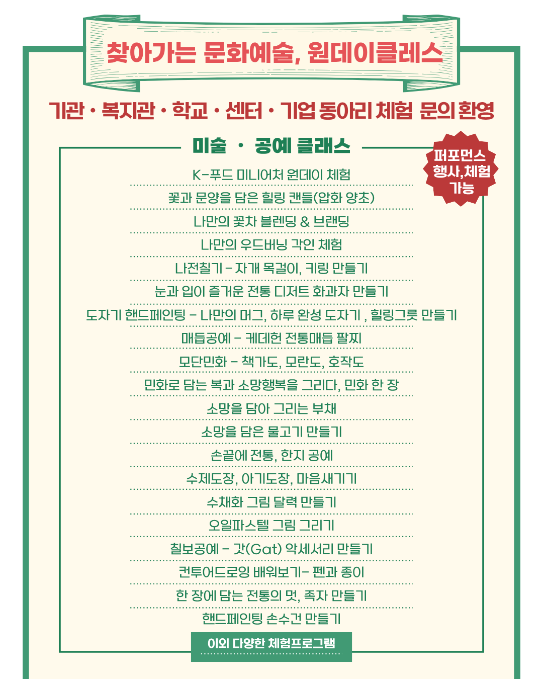 찾아가는 문화예술, 원데이 클래스 예술을 배우러 가는 것이 아니라, 예술이 직접 찾아가는 시간입니다. 국악·무용·미술·공예를 아우르는 찾아가는 문화예술 원데이 클래스 기관·복지관·학교·센터·기업 동아리 등 다양한 공간에서 진행 가능한 체험형 프로그램입니다.