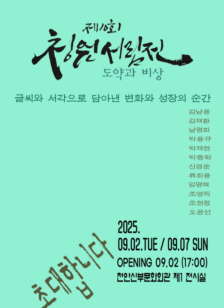 제10회 청원서림전 ‘도약과 비상’ ✒ 글씨와 서각으로 담아낸 변화와 성장의 순간 충남지회 지회장 및 충남지회 회원 -------------------------------------- 예술은 단순히 표현이 아니라, 삶의 이야기를 담아내는 또 하나의 언어입니다. 2025년 9월 2일, 천안 신부문화회관 제1전시실에서 열리는 제10회 청원서림전 ‘도약과 비상’은 바로 그 언어가 힘을 발휘하는 자리입니다. 청원서림, 10년의 여정 청원서림은 2011년, 사단법인 대한민국전통예술전승원 충청남도 지회장인 '청원 오윤선' 선생의 제자들이 함께 모여 창립한 단체입니다. 그리고 이번 전시는 어느덧 10번째를 맞이했습니다. 그동안의 발자취는 글씨와 서각에 담겨, 단순한 기록을 넘어 도약(跳躍)과 비상(飛上)의 상징으로 자리 잡았습니다. 전시 일정 & 오프닝 2025. 9. 2(화) ~ 9. 7(일) 오프닝 : 9월 2일(화) 17:00