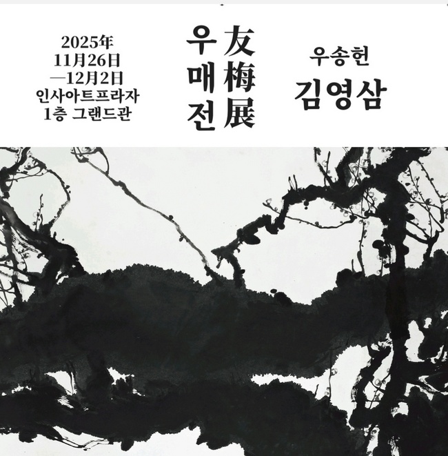 우송헌 김영삼, 우매전(友梅展) 매화와 우정의 시간, 느림의 가치를 말하다 김영삼(우송헌) 작가는 수묵, 서예, 회화를 넘나들며 한국 전통미학을 현대적으로 확장해온 예술가이다. 그는 붓과 먹, 종이의 물성을 깊이 탐구하며, 형상보다는 기운과 여백, 정신의 울림을 중시하는 작업을 지속해왔다. 이번 《우매전友梅展》은 오랜 세월 매화와 더불어 사유해온 작가의 예술 세계를 집약적으로 보여주는 자리로, 자연과 인간, 정신과 예술의 교감을 담은 신작들이 선보인다. 따라서 이번 전시는 예술가로서의 한 평생으로 빚어낸 ‘매화의 정신’과 ‘먹의 철학’을 통해, 전통의 뿌리에서 피어난 응축된 현대적 수묵의 가능성을 조명한다. 이번 전시작품 평론을 맡은 김종근 평론가는 “혹한의 겨울 끝자락에서 가장 먼저 피어나 삭풍의 침묵을 깨우고, 봄의 문을 열어젖히는 이 매화를 보기 위해 우송헌 김영삼은 십 수 년간 한국의 고매(古梅)를 찾아다니며 탐매(探梅)한 매화에 대한 사랑의 끝판이자 결과물이다”고 평했다. 이는 전통에 숨 쉬는 매화의 정신과 아름다움을 화폭에 담아내 대중의 매너에 부합하는 향연이 기다리고 있다. 김영삼 작가는 “오랜 벗이자, 세월 속에서 나와 함께 자라온 존재로서의 매화다. ‘우송매(愚松梅)’는 매화를 통해 알게 된 꾸준함과 기다림, 그리고 느린 생장의 시간 속에서 발견한 삶의 태도이자 마음의 자리이다. 매화나무의 선을 따라 발견한, 언어로 가 닿지 않는 시간과 존재의 관계를 이렇게 그림에 남긴다“라고 표현한 시인이자 철학가요 화가이다. ‘우매(友梅)’는 오랜 벗이자 매화를 뜻하지만, 동시에 작가의 호 ‘우송헌(愚松軒)’의 ‘우(愚)’와 통한다. 빠른 세상 속에서 다소 어리석을 만큼 한결같이 한 길을 걸어온 시간의 기록, 그리고 그 어리석음이 만들어낸 꾸준함의 가치가 이번 전시의 근간이다. 전시는 두 개의 장으로 구성된다.〈우송매(愚松梅)〉에서는 전국의 명매(名梅)를 찾아다니며 십여 년간 그린 회화들을 선보인다. 매화의 곡선과 고목의 형세 속에는 생명의 시간과 의지가 공존하며, 절제와 강인함이 동시에 피어나는 자연의 정신이 깃든다. 〈함께 쓰는 아침〉은 매일 시를 주고받은 친구와의 교류를 바탕으로 한글서예 작품을 모았다. 시를 붓으로 옮기고 다시 자신의 언어로 되새기며, 한글서예는 언어와 마음 사이의 틈을 메우는 수행의 과정이자 우정의 기록이 된다. 김영삼 작가에게 매화와 친구는 시간이 빚어낸 형태이자 마음의 지표이다. 《우매전》은 그들과 함께한 느리고 단단한 시간을 통해, 일상의 속도에 잠식된 우리에게 ‘기다림의 미학’을 되새기게 한다. 한편 김영삼 작가는 동국대학교 교육대학원을 졸업하고, 뉴욕 주립대학교 객원교수, 대전대학교 겸임교수, 경희대학교·동국대학교·호남대학교 등에서 외래교수로 재직하며 후학을 양성해왔다. 현재 중국 서화국제대학 특임교수이자 인사동 우송헌 먹그림집의 원장으로 활동 중이다. 그는 국전 특선 3회, 동아미술상, 서예문화상, 한국예총 예술문화상(미술부문 대상) 등 다수의 수상 경력을 보유하고 있으며, 예술의전당 한가람미술관, 가나인사아트센터, 학고재 갤러리, 퀸즈뮤지엄 등 국내외 주요 기관에서 다수의 전시에 참여했다. [출처] http://www.bcnews.kr/news/view.php?idx=28520 대한민국전통예술전승원 미술분과 국제분과위원장 -------------------------------------- 전시 일정 : 2025.11.26(수) - 12. 2(화) 장소 : 인사동소재 인사아트 프라자 1층 그랜드관